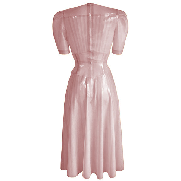 Our elegant midi dress in a stunning pleat appliqué enhances your cleavage with a deep navel skimming v shaped neckline leading to a perfect cinched in waist. The waist is shaped by a built in waspie with carefully structured boning.