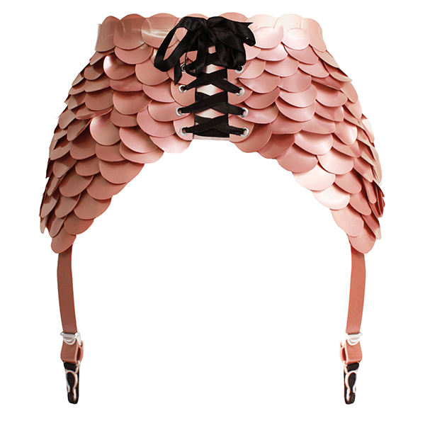 The belt fits to the rear via ribbon lacing so that you can use a like to a corset to pull in to your desired fit.