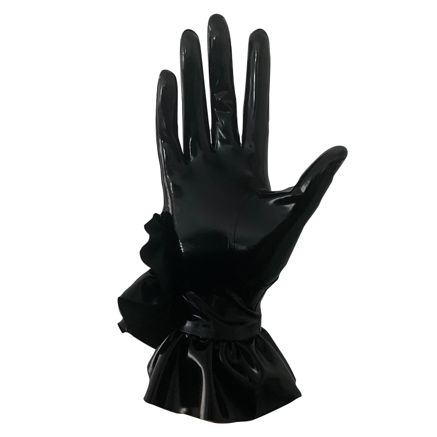 Drama gloves are hand made and feature a swirling, ruffled frill and double latex covered side buttons.