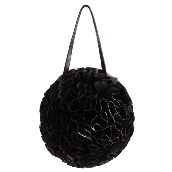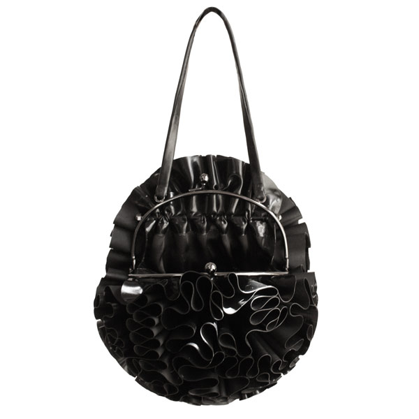 This stunning bag is carefully constructed from layers and layers of folded latex to form a full circle. The bag catches the light from all angles and the effect is truly stunning.