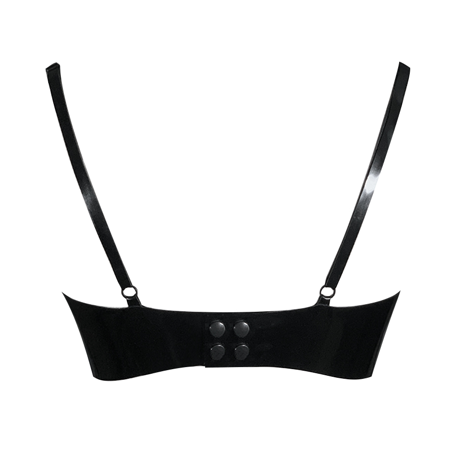 The bra has fully adjustable shoulder straps and fastens at the rear with poppers.