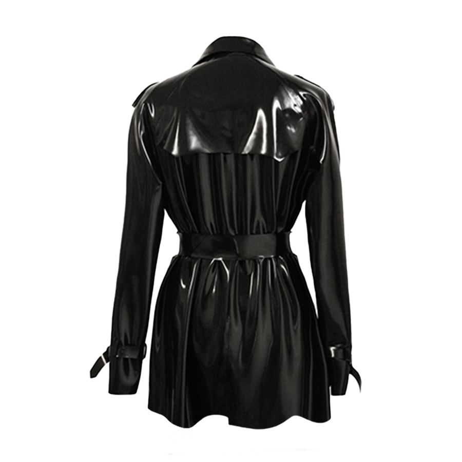 This stunning trenchcoat has all the features of this classic design, in latex!