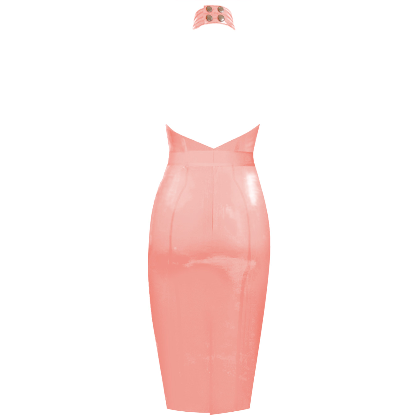 It fastens with two poppers at the back of the neck and a hidden rear zip, making this a virtually backless dress. It also features a rear split in the skirt.