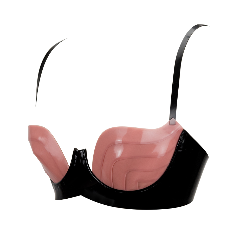 The bra has fully adjustable shoulder straps and fastens at the rear with poppers.