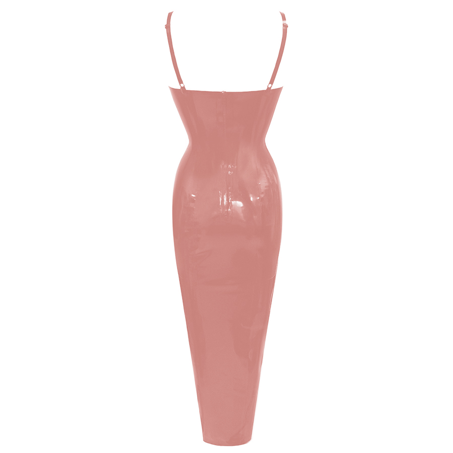 The dress sits at ankle length. It has fully adjustable shoulder straps and fastens with a zip to the rear.