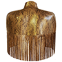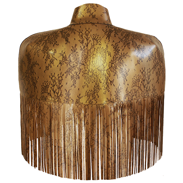A spectacular design this cape curves elegantly over the shoulders and upper back as a soft tassel trim falls around the arms and continues completely around the back.