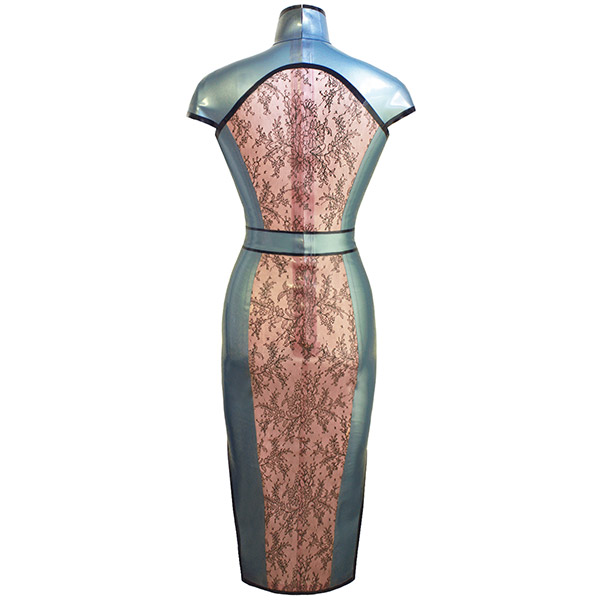 Straight from the catwalk this beautiful dress has a high neck mandarin shaped collar complemented by a curved design across the chest. This shape highlights a stunning front centre panel of semi transparent lace latex.