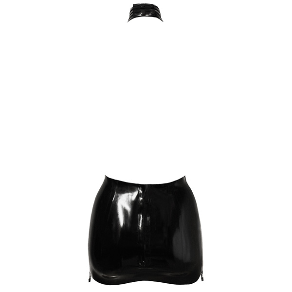 This show stopping piece features a high neck collar leading down via an enticing centre strap to a super short skirt with a diamond shaped feature and seductive strap design.