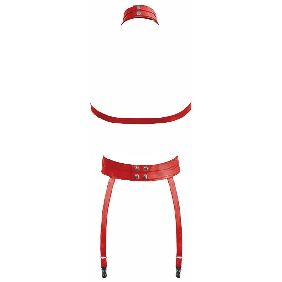 Our luxurious Playsuit features a provocative neck collar and belt. Each feature one D ring fitting in place to attach a lead or cuffs using a clip.
