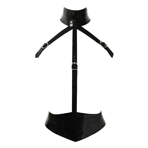 This bewitching Harness style playsuit top features a provocative neck collar and belt complemented by a restricted style strap design.