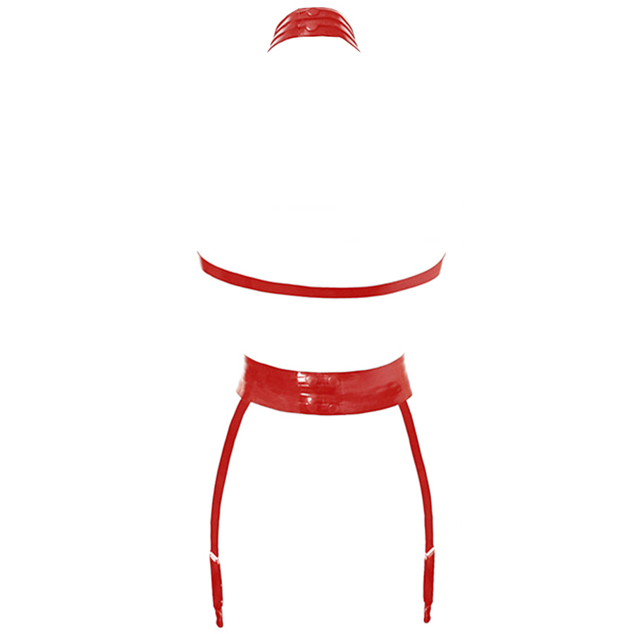 This bewitching playsuit features a provocative neck collar and belt complemented by a restricted style strap design.