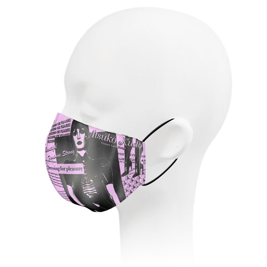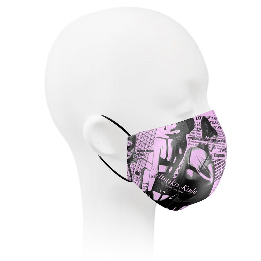 A beautifully printed silk face mask featuring images of Atsuko Kudo latex designs.