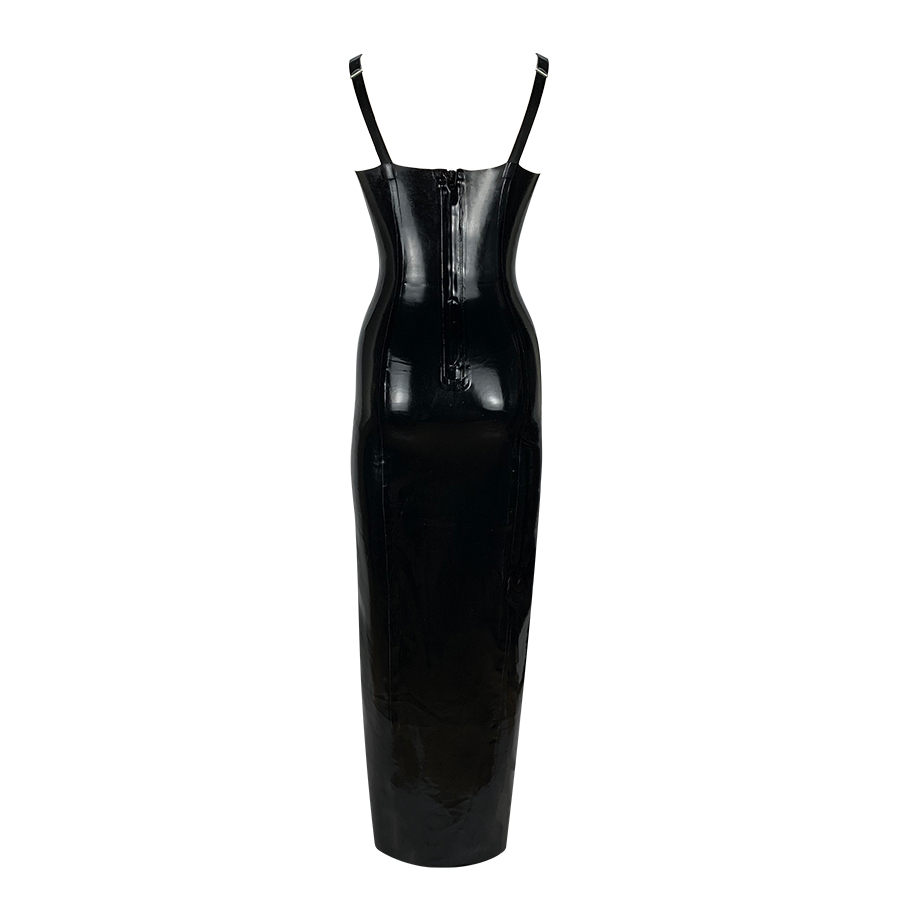The dress sits at ankle length. It has fully adjustable shoulder straps and fastens with a zip to the rear.